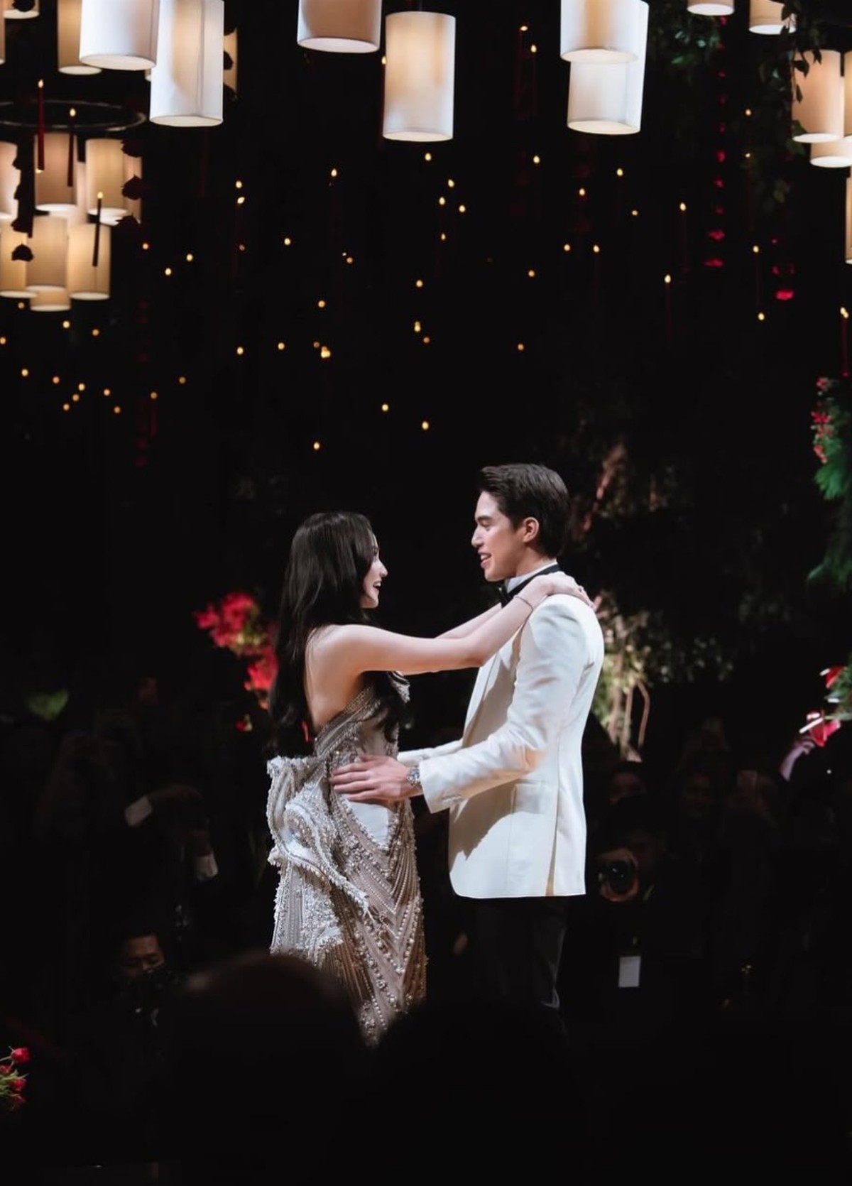 Berbanding kontras dengan akad yang tradisional, resepsi pernikahan menghadirkan suasana yang lebih modern, glamor, dan berkelas internasional. Syifa Hadju tampil sebagai pusat perhatian dalam balutan gaun couture rancangan Tex Saverio. Gaun bernuansa champagne hingga ivory ini dirancang dengan siluet bodycon yang membingkai tubuh secara presisi, menciptakan kesan ramping dan elegan. Detail payet, kristal, dan manik-manik disusun dalam pola vertikal yang tidak hanya memperindah, tetapi juga memberikan ilusi tubuh yang lebih jenjang.